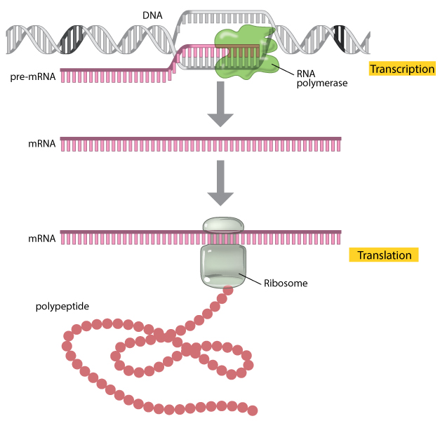 Figure 1: A gene is expressed through the processes of transcription and translation. During transcription, the enzyme RNA polymerase (green) uses DNA as a template to produce a pre-mRNA transcript (pink). The pre-mRNA is processed to form a mature mRNA molecule that can be translated to build the protein molecule (polypeptide) encoded by the original gene.