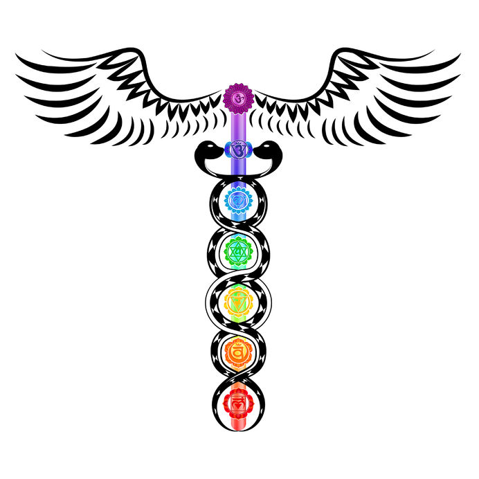 Kundalini image showing the vagus nerve as the 2 snakes (ida and pingala) and the spinal cord (sushumna) as the center pillar and the wings being the awakened brain.
