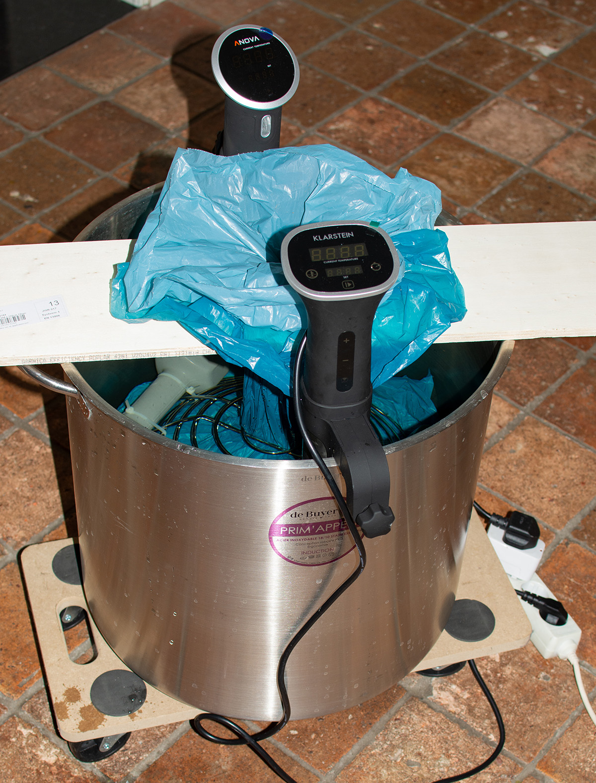 Mix dry Add water to field capacity Pasteurize @ 140F for 12 hours (submerge in water with sous vide set to 142F and bags slightly open on top sticking out of the water so it can breathe) After 12 hours let it slowly cool in the same water for another 12 hours. The substrate needs fresh air as it needs oxygen for the good bacteria that grow in symbiosis with the PanCyan - the so called thermophilic Actinobacillus. After 24 hours Mix the grain with substrate in the monotub with the top air vents open (filtered off course) and make the mix 7cm thick. This is also the reason why panaeolus normally prefers cow manure as it acts more like a liquid culture compared to horse manure. But the big problem with cow manure these days is that the cows are not eating grass anymore but corn and grain. This does not work as well. So you need cow manure from grass fed cows (the best). Colonization conditions: Temperature: 26C So make the room 25C and the good bacteria in the substrate make it inside the monotub 26C XXX XXX A look inside a 120 liter monotub filled with Panaeolus Hawaii mycelium. Ready to be cased. - After consolidation (when most of the soil is white) put a very thin casing layer on top at filed capacity.